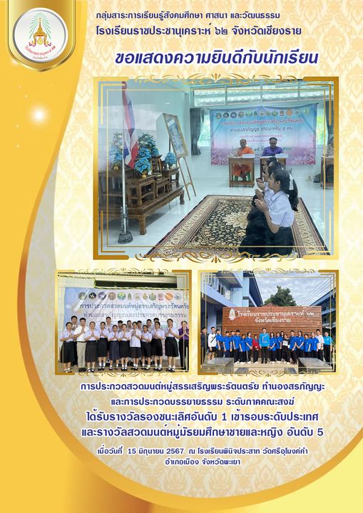 โรงเรียนราชประชานุเคราะห์ 62 จังหวัดเชียงราย ขอแสดงความยินดีกับนักเรียนที่เข้าร่วมการประกวดสวดมนต์หมู่สรรเสริญพระรัตนตรัยทำนองสรภัญญะและการประกวดบรรยายธรรม ระดับภาคคณะสงฆ์ ซึ่งได้รับรางวัลรองชนะเลิศอันดับ 1 การประกวดบรรยายธรรม เข้ารอบระดับประเทศ และรางวัลสวดมนต์หมู่มัธยมศึกษาชายและหญิง อันดับที่ 5